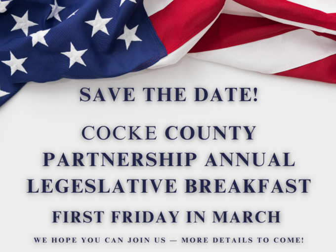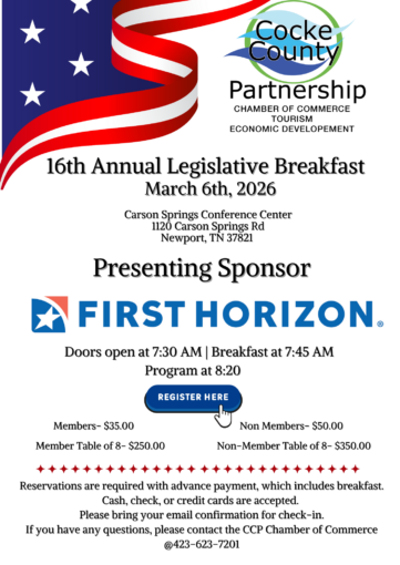 Join us for the Annual Legislative Breakfast, hosted by the Cocke County Partnership, held every year on the first Friday in March at the Carson Springs Conference Center. This important event brings together leaders from federal, state, and local offices to provide updates on current initiatives and issues impacting our community.